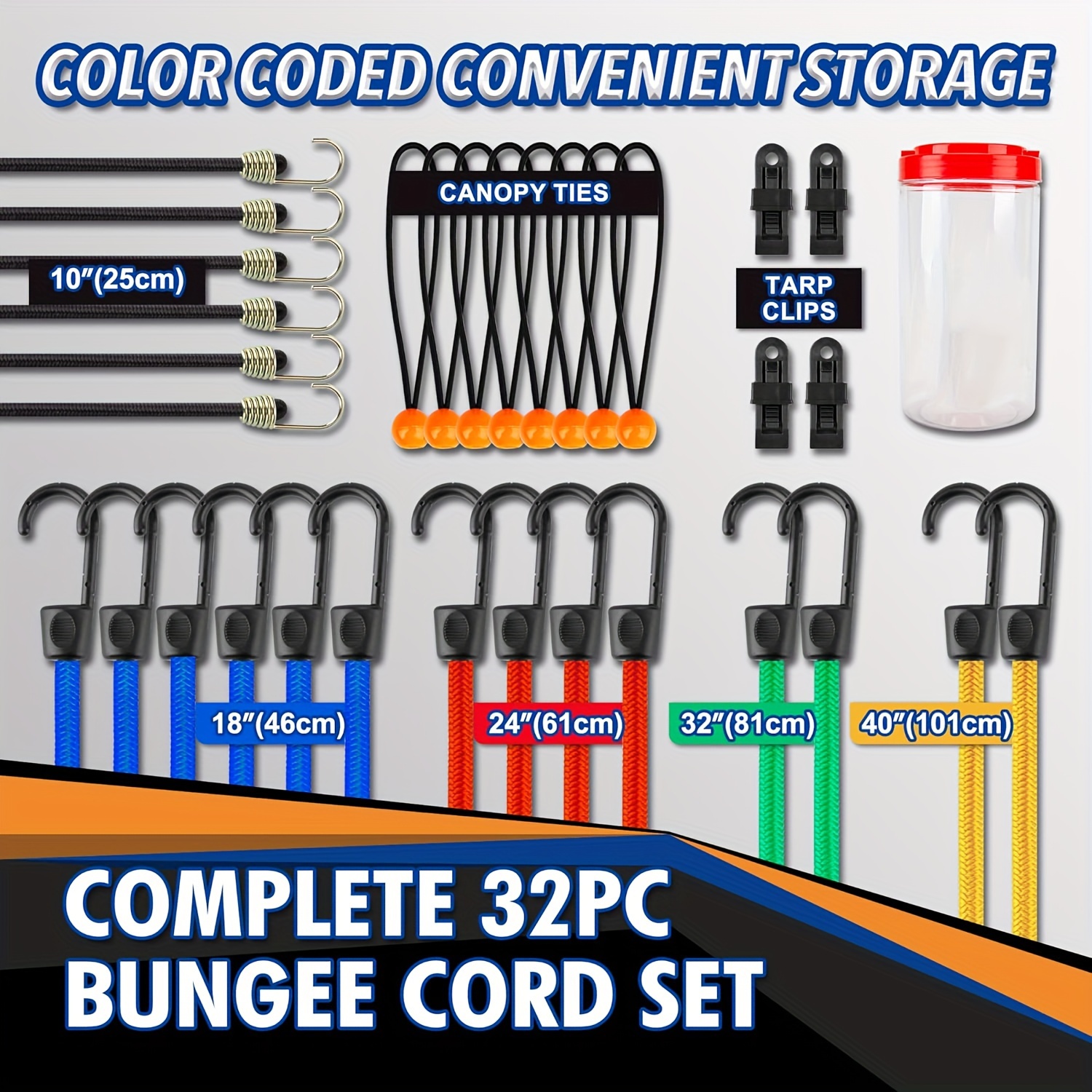 32-Piece Heavy-Duty Bungee Cord Assortment Kit - Includes 10", 18", 24", 32", 40